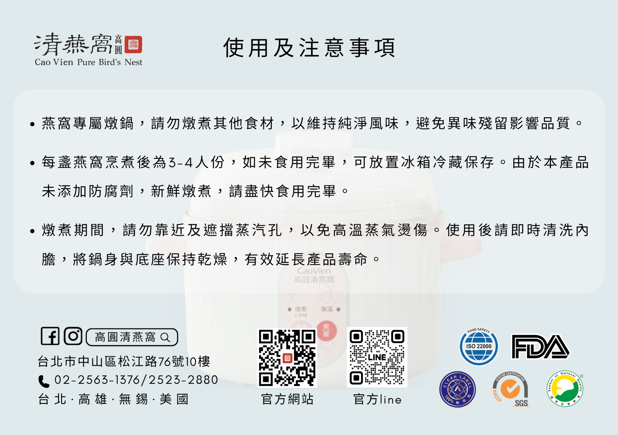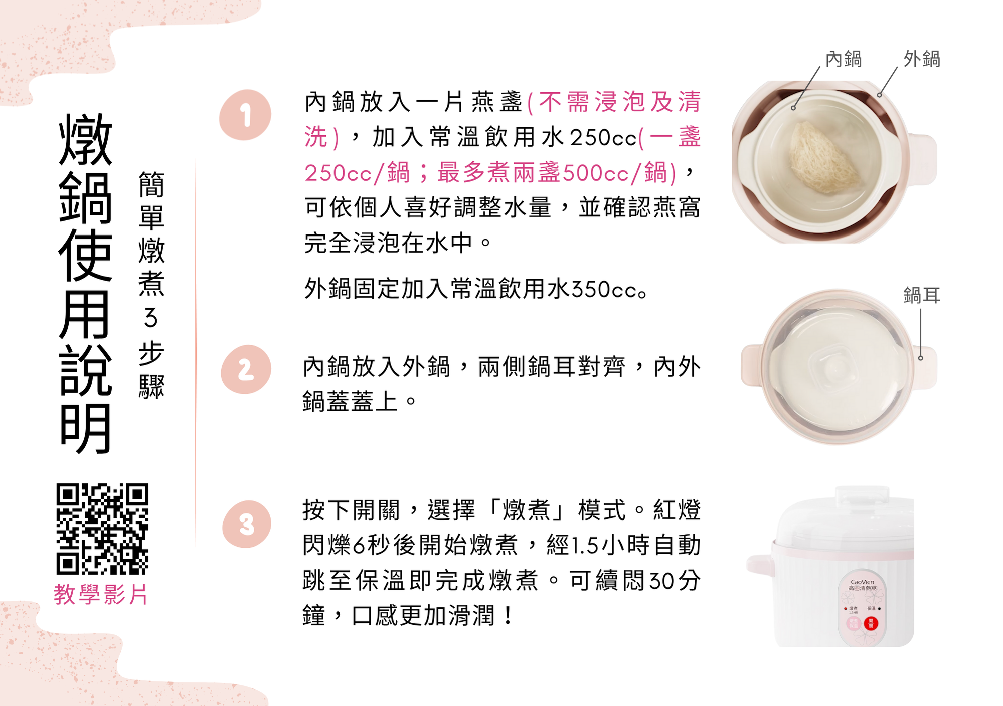 邀請到董事長親身示範燉煮燕窩,從開箱清點配件,逐一講解操作流程,並講解燉鍋的簡單保養方法,初次購買清燕窩必看!
